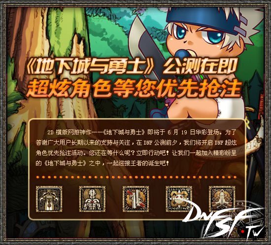 腾讯2008年最特权大作《地下城&勇士》定于6月19日震撼公测!为了答谢广大用户长期以来的关心与支持,在DNF公测前夕,我们将提前开启DNF“角色抢注 优先体验”游戏的特权活动。