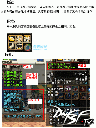 装备的属性可以分为固定属性、附加属性和套装属性。固定属性是同种类的装备必定会有的属性。附加属性是每件装备随机附加的属性。套装属性是当玩家穿戴的装备达到套装要求后被激活的属性。在DNF中同一件装备的附加属性是固定的。