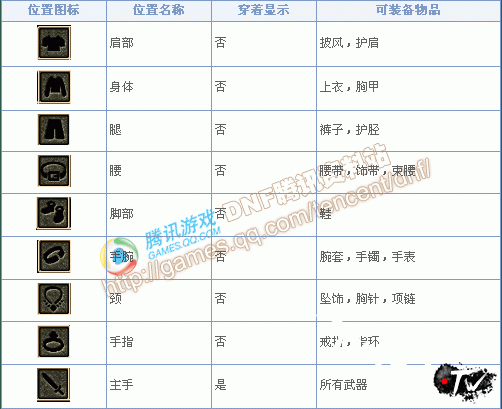 功能型装备共有9个装备位置,分别对应不同的部位,除了主手武器以外都不显示穿着。